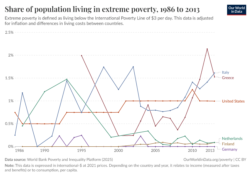 World Bank Poverty and Inequality Platform (2025) – with major processing by Our World in Data. “Share of population living in extreme poverty – World Bank” [dataset]. World Bank Poverty and Inequality Platform, “World Bank Poverty and Inequality Platform (PIP) 20250930_2021, 20250930_2017” [original data]. Retrieved January 8, 2026 from https://archive.ourworldindata.org/20251209-133038/grapher/share-of-population-in-extreme-poverty.html (archived on December 9, 2025).