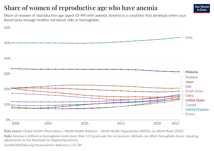 “Data Page: Share of women of reproductive age who have anemia”. Our World in Data (2026). Data adapted from Global Health Observatory / World Health Statistics - World Health Organization (WHO), via World Bank. Retrieved from https://archive.ourworldindata.org/20260112-111535/grapher/prevalence-of-anemia-in-women-of-reproductive-age-aged-15-29.html [online resource] (archived on January 12, 2026).How to cite this data