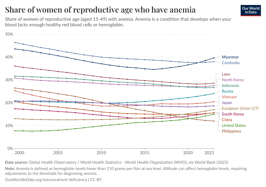 Global Health Observatory / World Health Statistics - World Health Organization (WHO), via World Bank (2025) – processed by Our World in Data. “Share of women of reproductive age who have anemia” [dataset]. Global Health Observatory / World Health Statistics - World Health Organization (WHO), via World Bank, “World Development Indicators 122” [original data]. Retrieved January 16, 2026 from https://archive.ourworldindata.org/20260112-111535/grapher/prevalence-of-anemia-in-women-of-reproductive-age-aged-15-29.html (archived on January 12, 2026).