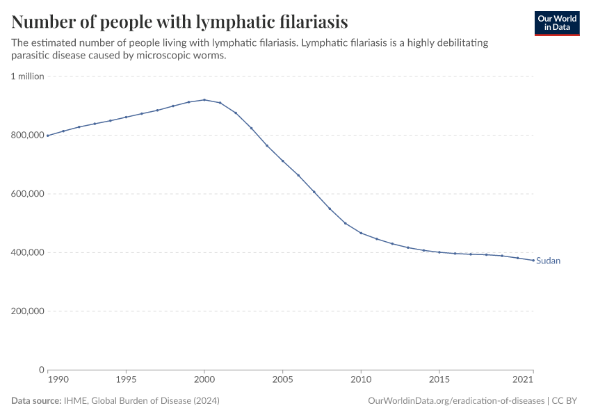 “Data Page: Number of people with lymphatic filariasis”, part of the following publication: Esteban Ortiz-Ospina and Max Roser (2016) - “Global Health”. Data adapted from IHME, Global Burden of Disease. Retrieved from https://archive.ourworldindata.org/20250909-093708/grapher/prevalence-of-lymphatic-filariasis.html [online resource] (archived on September 9, 2025).
