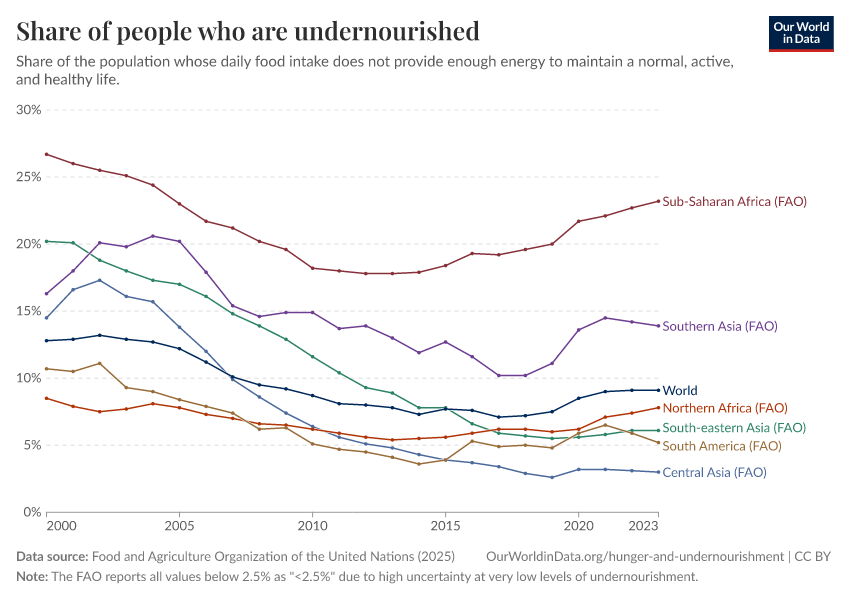 Food and Agriculture Organization of the United Nations (2025) – with major processing by Our World in Data. “Share of people who are undernourished – UN FAO” [dataset]. Food and Agriculture Organization of the United Nations, “SDG Indicators” [original data]. Retrieved February 5, 2026 from https://archive.ourworldindata.org/20250909-093708/grapher/prevalence-of-undernourishment.html (archived on September 9, 2025).