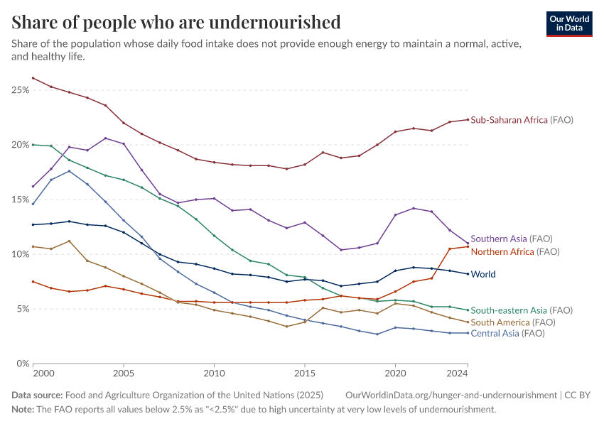 Food and Agriculture Organization of the United Nations (2025) – with major processing by Our World in Data. “Share of people who are undernourished – UN FAO” [dataset]. Food and Agriculture Organization of the United Nations, “SDG Indicators” [original data]. Retrieved January 15, 2026 from https://archive.ourworldindata.org/20250909-093708/grapher/prevalence-of-undernourishment.html (archived on September 9, 2025).