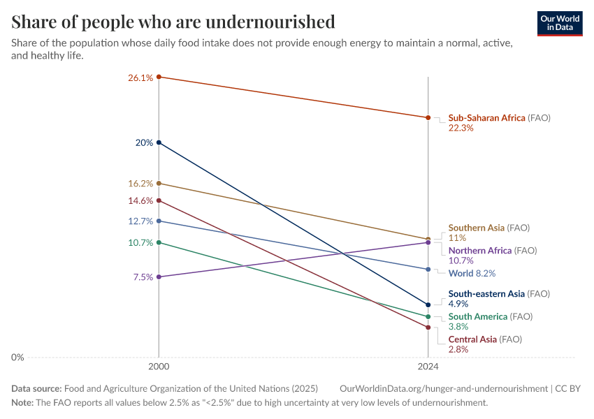 Food and Agriculture Organization of the United Nations (2025) – with major processing by Our World in Data. “Share of people who are undernourished – UN FAO” [dataset]. Food and Agriculture Organization of the United Nations, “SDG Indicators” [original data]. Retrieved April 5, 2026 from https://archive.ourworldindata.org/20260304-094028/grapher/prevalence-of-undernourishment.html (archived on March 4, 2026).Download