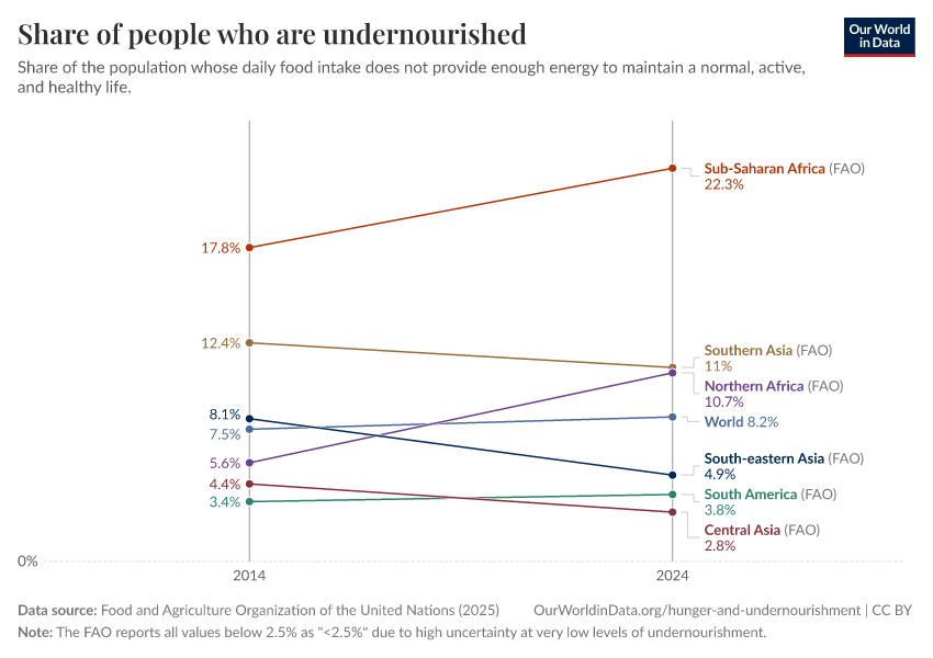 Food and Agriculture Organization of the United Nations (2025) – with major processing by Our World in Data. “Share of people who are undernourished – UN FAO” [dataset]. Food and Agriculture Organization of the United Nations, “SDG Indicators” [original data]. Retrieved April 14, 2026 from https://archive.ourworldindata.org/20260304-094028/grapher/prevalence-of-undernourishment.html (archived on March 4, 2026).