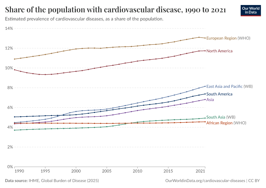 IHME, Global Burden of Disease (2025) – with major processing by Our World in Data. “Share of the population with cardiovascular disease – IHME” [dataset]. IHME, Global Burden of Disease, “Global Burden of Disease - Prevalence and Incidence” [original data]. Retrieved March 27, 2026 from https://archive.ourworldindata.org/20260319-181852/grapher/prevalence-rate-of-cardiovascular-disease.html (archived on March 19, 2026).