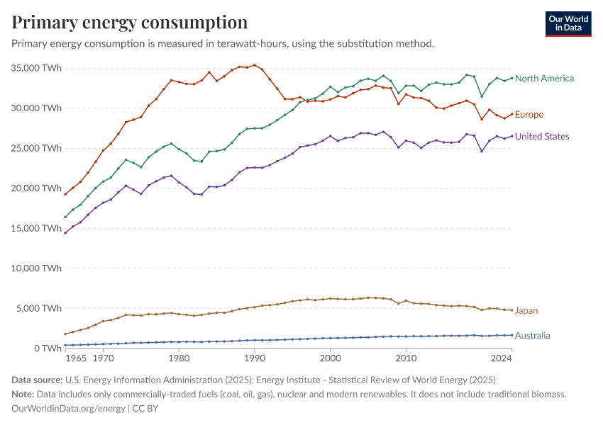 U.S. Energy Information Administration (2025); Energy Institute - Statistical Review of World Energy (2025) – with major processing by Our World in Data. “Primary energy consumption” [dataset]. U.S. Energy Information Administration, “International Energy Data”; Energy Institute, “Statistical Review of World Energy” [original data]. Retrieved January 14, 2026 from https://archive.ourworldindata.org/20250909-093708/grapher/primary-energy-cons.html (archived on September 9, 2025).