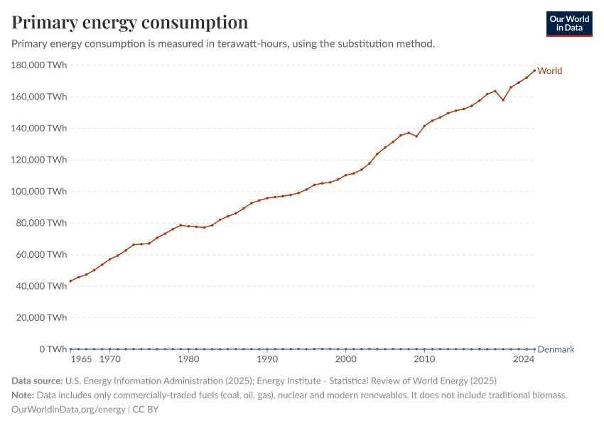 “Data Page: Primary energy consumption”, part of the following publication: Hannah Ritchie, Pablo Rosado, and Max Roser (2023) - “Energy”. Data adapted from U.S. Energy Information Administration, Energy Institute. Retrieved from https://archive.ourworldindata.org/20250909-093708/grapher/primary-energy-cons.html [online resource] (archived on September 9, 2025).How to cite this data