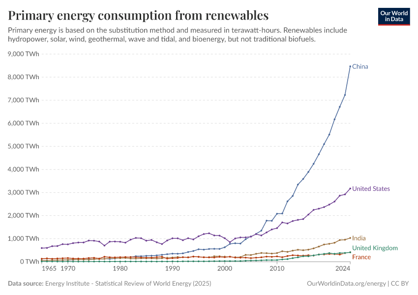 “Data Page: Primary energy consumption from renewables”, part of the following publication: Hannah Ritchie, Pablo Rosado, and Max Roser (2023) - “Energy”. Data adapted from Energy Institute. Retrieved from https://archive.ourworldindata.org/20250909-093708/grapher/primary-energy-renewables.html [online resource] (archived on September 9, 2025).