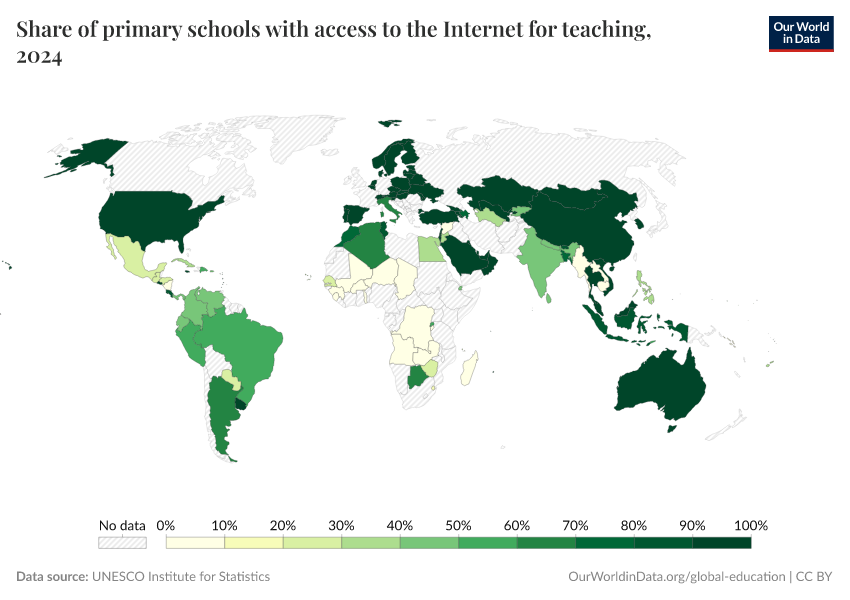 “Data Page: Share of primary schools with access to the Internet for teaching”. Our World in Data (2025). Data adapted from UNESCO Institute for Statistics. Retrieved from https://archive.ourworldindata.org/20251125-165536/grapher/primary-schools-with-access-to-internet.html [online resource] (archived on November 25, 2025).How to cite this data