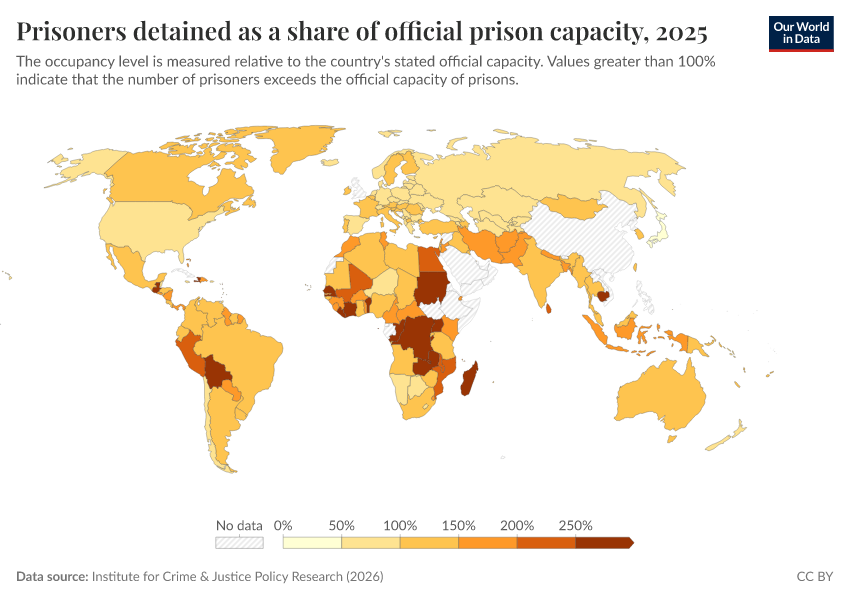 “Data Page: Prisoners detained as a share of official prison capacity”. Our World in Data (2026). Data adapted from Institute for Crime & Justice Policy Research. Retrieved from https://archive.ourworldindata.org/20260213-171235/grapher/prison-capacity.html [online resource] (archived on February 13, 2026).How to cite this data