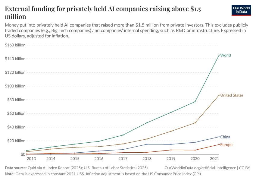 Quid via AI Index Report (2025); U.S. Bureau of Labor Statistics (2025) – with major processing by Our World in Data. “External funding for privately held AI companies raising above $1.5 million” [dataset]. Quid via AI Index Report, “AI Index Report”; U.S. Bureau of Labor Statistics, “US consumer prices” [original data]. Retrieved February 13, 2026 from https://archive.ourworldindata.org/20251119-141827/grapher/private-investment-in-artificial-intelligence.html (archived on November 19, 2025).