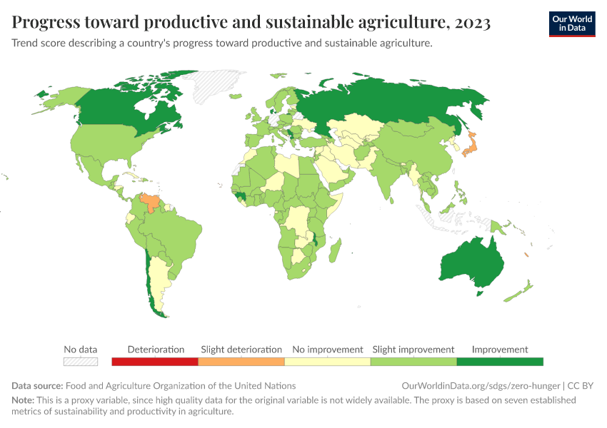“Data Page: Progress toward productive and sustainable agriculture”. Our World in Data (2025). Data adapted from Food and Agriculture Organization of the United Nations. Retrieved from https://archive.ourworldindata.org/20251125-165536/grapher/progress-toward-productive-and-sustainable-agriculture.html [online resource] (archived on November 25, 2025).How to cite this data