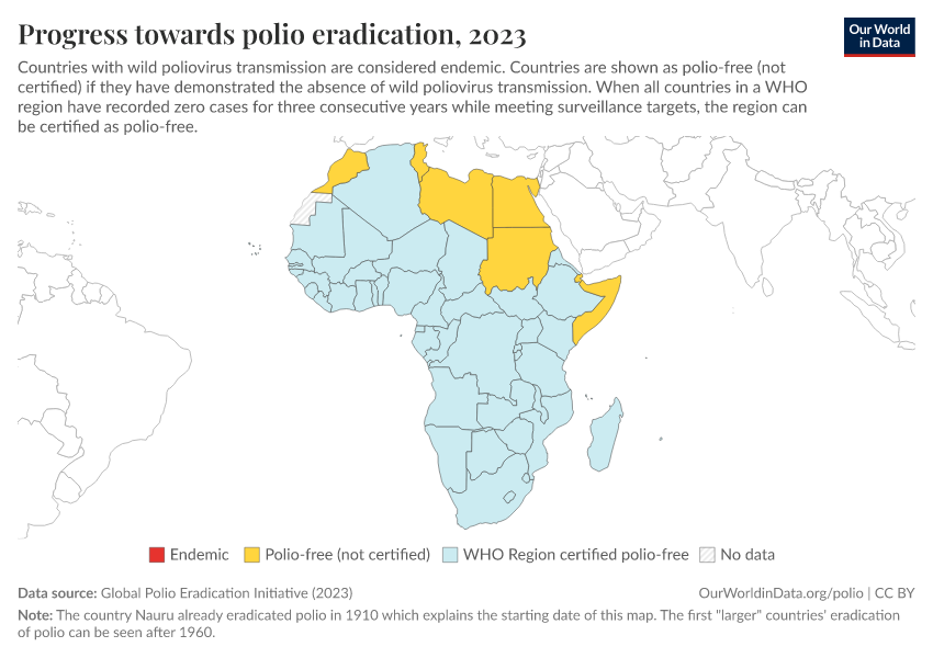 Global Polio Eradication Initiative (2023) – with minor processing by Our World in Data. “Progress towards polio eradication” [dataset]. Global Polio Eradication Initiative, “Polio-Free Countries” [original data]. Retrieved January 14, 2026 from https://archive.ourworldindata.org/20250909-093708/grapher/progress-towards-polio-eradication.html (archived on September 9, 2025).