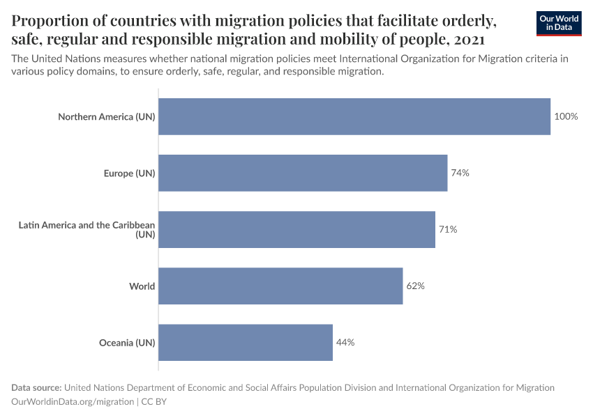 United Nations Department of Economic and Social Affairs Population Division and International Organization for Migration – processed by Our World in Data. “Proportion of countries with migration policies that facilitate orderly, safe, regular and responsible migration and mobility of people” [dataset]. United Nations Department of Economic and Social Affairs Population Division and International Organization for Migration, “Data from multiple sources” [original data]. Retrieved December 19, 2025 from https://archive.ourworldindata.org/20251125-165536/grapher/proportion-countries-migration-policies-criteria.html (archived on November 25, 2025).