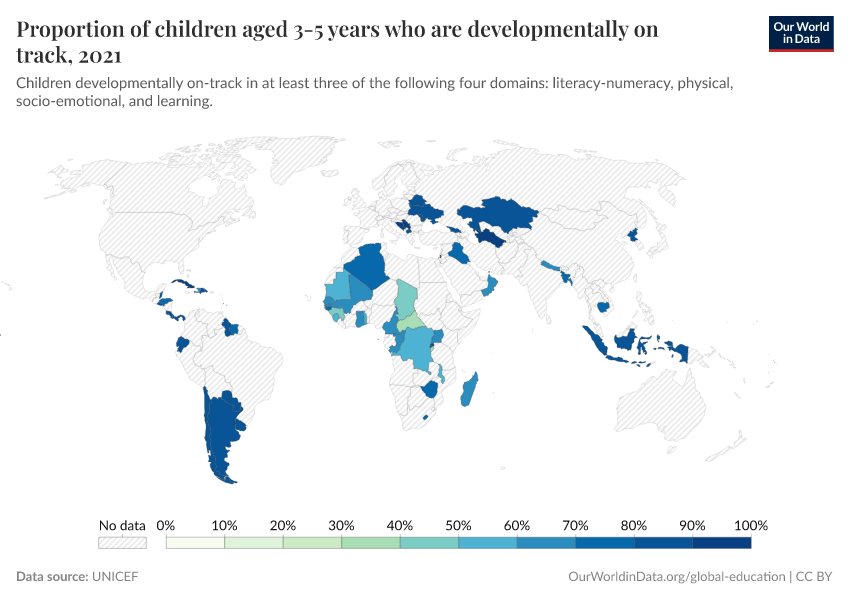 “Data Page: Proportion of children aged 3-5 years who are developmentally on track”. Our World in Data (2025). Data adapted from UNICEF. Retrieved from https://archive.ourworldindata.org/20251121-151713/grapher/proportion-of-children-developmentally-on-track.html [online resource] (archived on November 21, 2025).How to cite this data