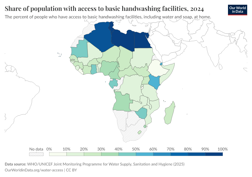 “Data Page: Share of population with access to basic handwashing facilities”, part of the following publication: Hannah Ritchie, Fiona Spooner, and Max Roser (2021) - “Clean Water and Sanitation”. Data adapted from World Health Organization/UNICEF Joint Monitoring Programme for Water Supply, Sanitation and Hygiene. Retrieved from https://archive.ourworldindata.org/20260109-172523/grapher/proportion-of-population-with-basic-handwashing-facilities-on-premises.html [online resource] (archived on January 9, 2026).How to cite this data