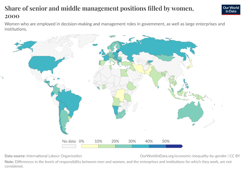 “Data Page: Share of senior and middle management positions filled by women”. Our World in Data (2026). Data adapted from International Labour Organization. Retrieved from https://archive.ourworldindata.org/20251120-211038/grapher/proportion-of-women-in-senior-and-middle-management-positions.html [online resource] (archived on November 20, 2025).