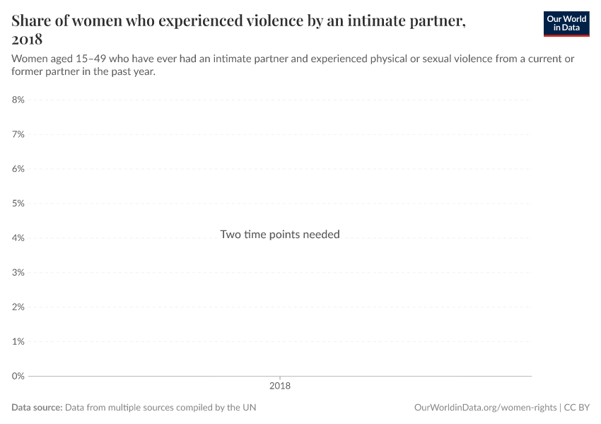 “Data Page: Share of women who experienced violence by an intimate partner”. Our World in Data (2025). Data adapted from Data from multiple sources compiled by the UN. Retrieved from https://archive.ourworldindata.org/20251125-165536/grapher/proportion-of-women-subjected-to-physical-or-sexual-violence.html [online resource] (archived on November 25, 2025).How to cite this data
