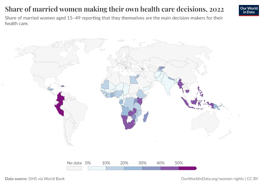 “Data Page: Share of married women making their own health care decisions”, part of the following publication: Bastian Herre, Veronika Samborska, Pablo Arriagada, and Hannah Ritchie (2023) - “Women’s Rights”. Data adapted from World Bank Gender Statistics. Retrieved from https://archive.ourworldindata.org/20260304-094028/grapher/proportion-of-women-who-make-their-own-informed-health-care-decisions.html [online resource] (archived on March 4, 2026).How to cite this data