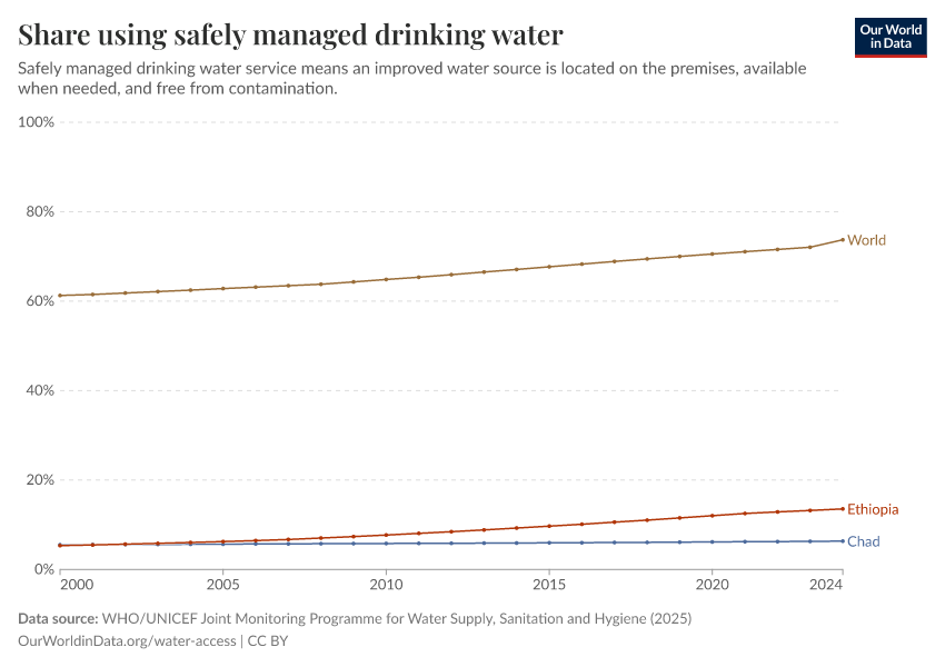 WHO/UNICEF Joint Monitoring Programme for Water Supply, Sanitation and Hygiene (2025) – processed by Our World in Data. “Share using safely managed drinking water” [dataset]. World Health Organization/UNICEF Joint Monitoring Programme for Water Supply, Sanitation and Hygiene, “WHO/UNICEF Joint Monitoring Programme for Water Supply, Sanitation and Hygiene (JMP) 2000-2024 report” [original data]. Retrieved March 5, 2026 from https://archive.ourworldindata.org/20260304-094028/grapher/proportion-using-safely-managed-drinking-water.html (archived on March 4, 2026).