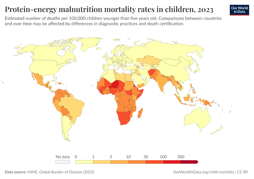 IHME, Global Burden of Disease (2025) – with major processing by Our World in Data. “Protein-energy malnutrition mortality rates in children – IHME” [dataset]. IHME, Global Burden of Disease, “Global Burden of Disease - Deaths” [original data]. Retrieved April 5, 2026 from https://archive.ourworldindata.org/20260330-100833/grapher/protein-energy-malnutrition-mortality-rates-in-children.html (archived on March 30, 2026).