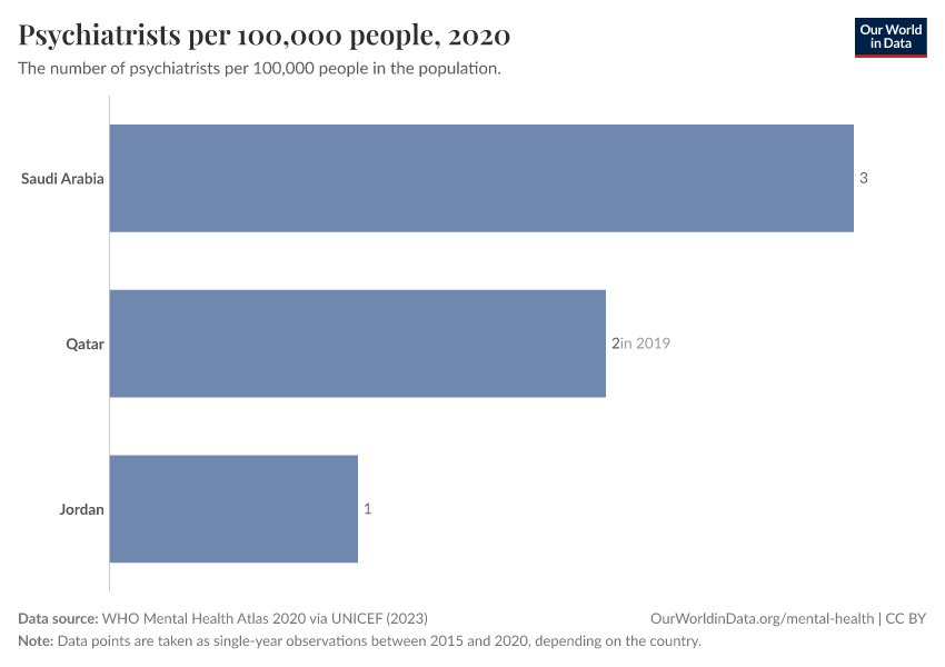 WHO Mental Health Atlas 2020 via UNICEF (2023) – with major processing by Our World in Data. “Psychiatrists per 100,000 people” [dataset]. WHO Mental Health Atlas 2020 via UNICEF, “Countdown for Global Mental Health 2030” [original data]. Retrieved January 15, 2026 from https://archive.ourworldindata.org/20250909-093708/grapher/psychiatrists-working-in-the-mental-health-sector.html (archived on September 9, 2025).