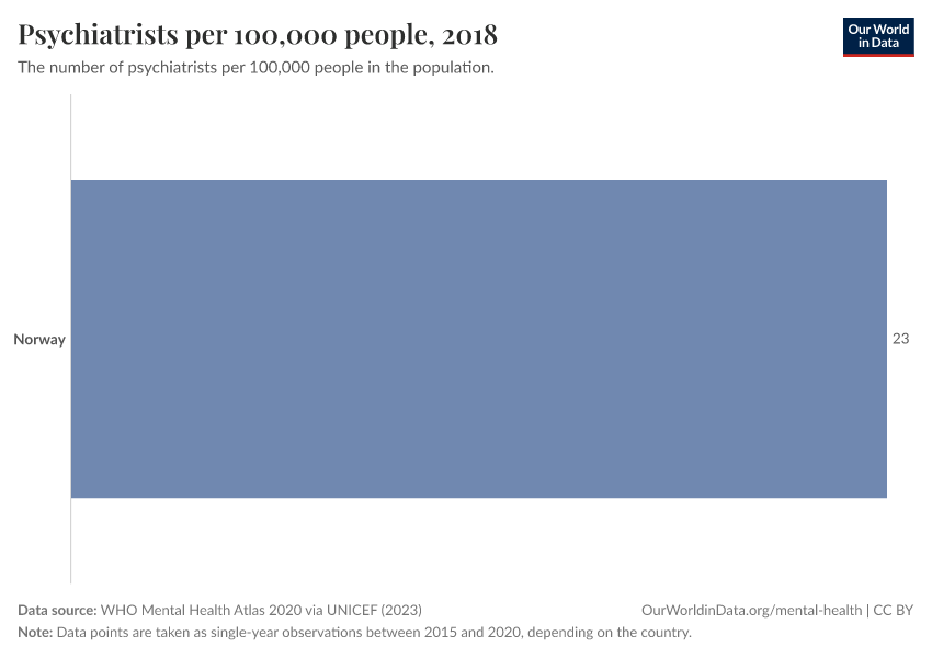 “Data Page: Psychiatrists per 100,000 people”, part of the following publication: Saloni Dattani, Lucas Rodés-Guirao, Hannah Ritchie, and Max Roser (2023) - “Mental Health”. Data adapted from WHO Mental Health Atlas 2020 via UNICEF. Retrieved from https://archive.ourworldindata.org/20250909-093708/grapher/psychiatrists-working-in-the-mental-health-sector.html [online resource] (archived on September 9, 2025).How to cite this data