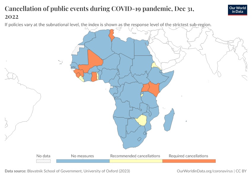 Blavatnik School of Government, University of Oxford (2023) – with minor processing by Our World in Data. “Cancellation of public events during COVID-19 pandemic” [dataset]. Blavatnik School of Government, University of Oxford, “Government Response Tracker (OxCGRT)” [original data]. Retrieved January 14, 2026 from https://archive.ourworldindata.org/20250909-093708/grapher/public-events-covid.html (archived on September 9, 2025).