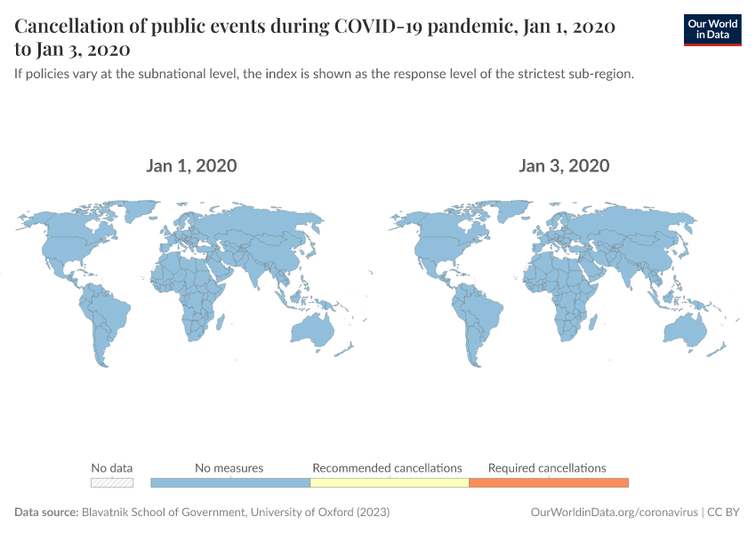 Blavatnik School of Government, University of Oxford (2023) – with minor processing by Our World in Data. “Cancellation of public events during COVID-19 pandemic” [dataset]. Blavatnik School of Government, University of Oxford, “Government Response Tracker (OxCGRT)” [original data]. Retrieved December 20, 2025 from https://archive.ourworldindata.org/20250909-093708/grapher/public-events-covid.html (archived on September 9, 2025).