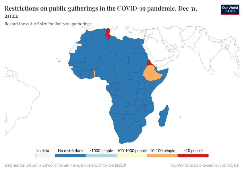“Data Page: Restrictions on public gatherings in the COVID-19 pandemic”, part of the following publication: Edouard Mathieu, Hannah Ritchie, Lucas Rodés-Guirao, Cameron Appel, Daniel Gavrilov, Charlie Giattino, Joe Hasell, Bobbie Macdonald, Saloni Dattani, Diana Beltekian, Esteban Ortiz-Ospina, and Max Roser (2020) - “COVID-19 Pandemic”. Data adapted from Blavatnik School of Government, University of Oxford. Retrieved from https://archive.ourworldindata.org/20250909-093708/grapher/public-gathering-rules-covid.html [online resource] (archived on September 9, 2025).How to cite this data