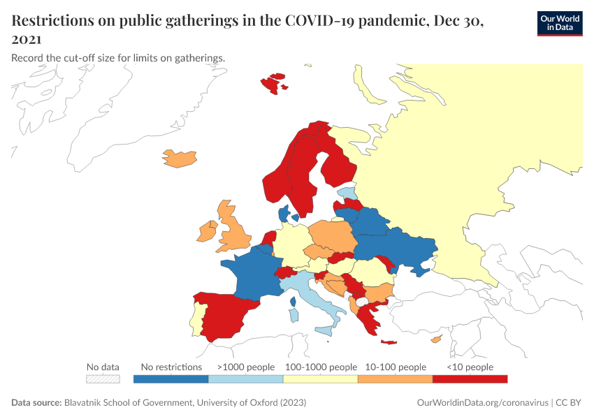 Blavatnik School of Government, University of Oxford (2023) – with minor processing by Our World in Data. “Restrictions on public gatherings in the COVID-19 pandemic” [dataset]. Blavatnik School of Government, University of Oxford, “Government Response Tracker (OxCGRT)” [original data]. Retrieved January 27, 2026 from https://archive.ourworldindata.org/20250909-093708/grapher/public-gathering-rules-covid.html (archived on September 9, 2025).