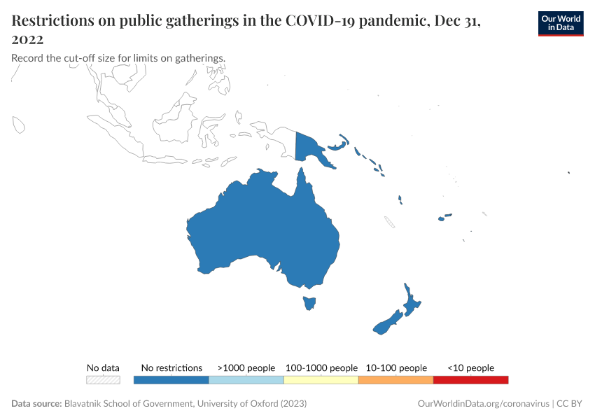 Blavatnik School of Government, University of Oxford (2023) – with minor processing by Our World in Data. “Restrictions on public gatherings in the COVID-19 pandemic” [dataset]. Blavatnik School of Government, University of Oxford, “Government Response Tracker (OxCGRT)” [original data]. Retrieved December 8, 2025 from https://archive.ourworldindata.org/20250909-093708/grapher/public-gathering-rules-covid.html (archived on September 9, 2025).