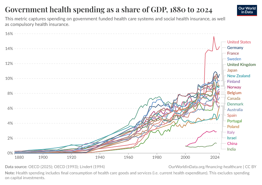 OECD (2025); OECD (1993); Lindert (1994) – with major processing by Our World in Data. “Public health expenditure as a share of GDP – Lindert, OECD – Historical data” [dataset]. OECD, “OECD Health Expenditure and Financing Database”; OECD, “OECD Health Systems”; Lindert, “The rise of social spending (1880-1930)” [original data]. Retrieved December 10, 2025 from https://archive.ourworldindata.org/20250909-093708/grapher/public-health-expenditure-share-gdp.html (archived on September 9, 2025).