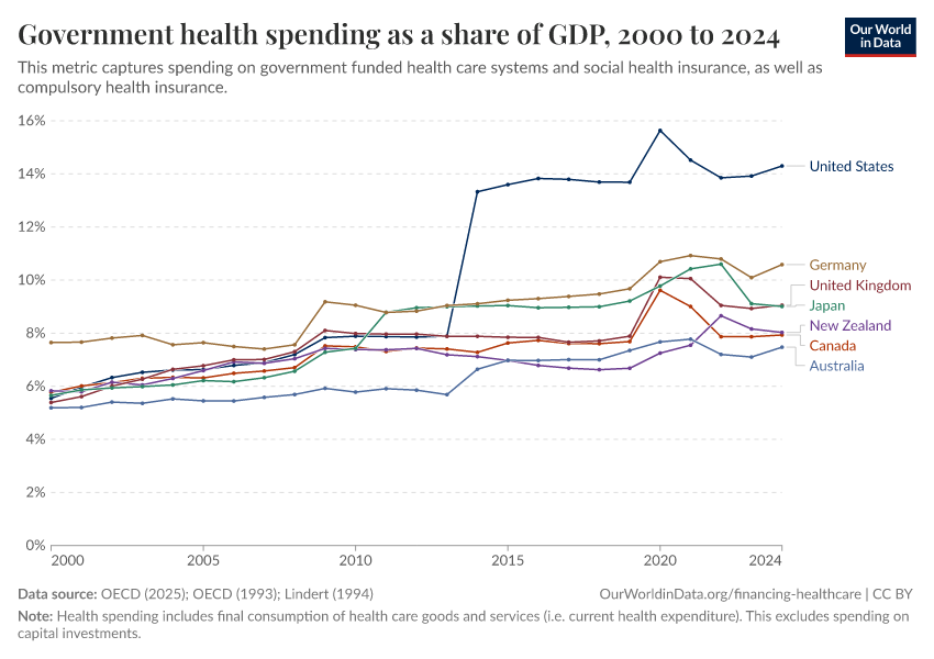 OECD (2025); OECD (1993); Lindert (1994) – with major processing by Our World in Data. “Public health expenditure as a share of GDP – Lindert, OECD – Historical data” [dataset]. OECD, “OECD Health Expenditure and Financing Database”; OECD, “OECD Health Systems”; Lindert, “The rise of social spending (1880-1930)” [original data]. Retrieved April 3, 2026 from https://archive.ourworldindata.org/20260304-094028/grapher/public-health-expenditure-share-gdp.html (archived on March 4, 2026).Download