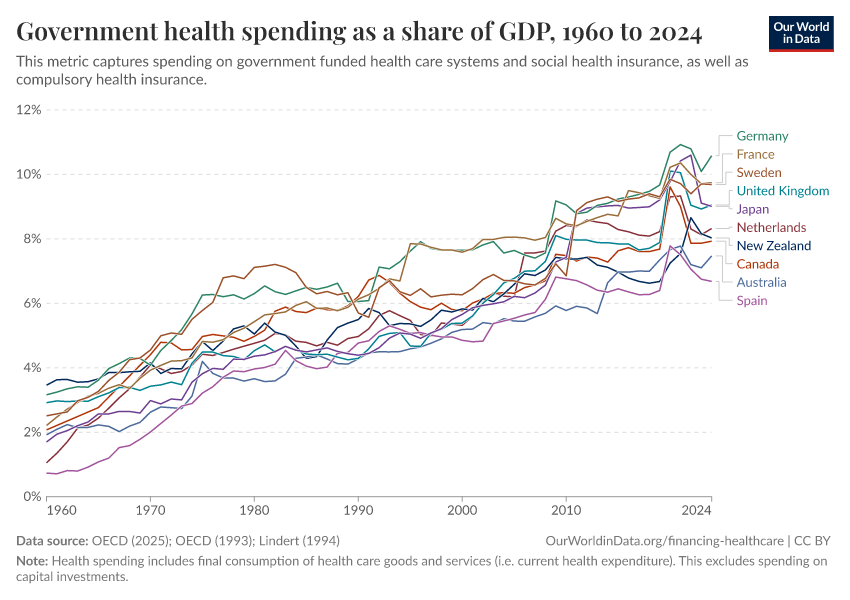 OECD (2025); OECD (1993); Lindert (1994) – with major processing by Our World in Data. “Public health expenditure as a share of GDP – Lindert, OECD – Historical data” [dataset]. OECD, “OECD Health Expenditure and Financing Database”; OECD, “OECD Health Systems”; Lindert, “The rise of social spending (1880-1930)” [original data]. Retrieved April 4, 2026 from https://archive.ourworldindata.org/20260304-094028/grapher/public-health-expenditure-share-gdp.html (archived on March 4, 2026).Download
