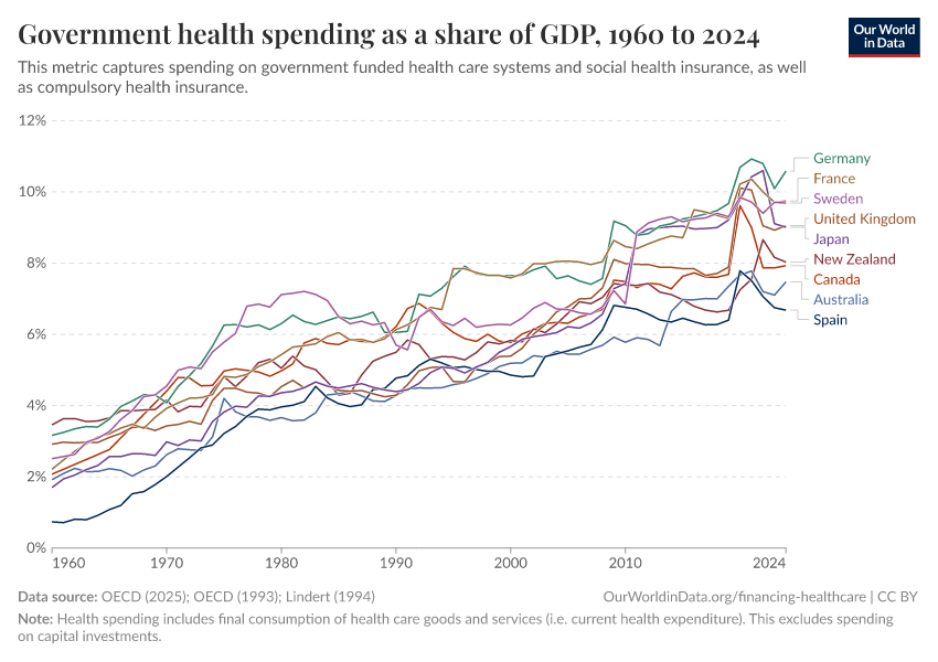 “Data Page: Public health expenditure as a share of GDP”, part of the following publication: Esteban Ortiz-Ospina, Pablo Arriagada, and Max Roser (2017) - “Healthcare Spending”. Data adapted from OECD, Lindert. Retrieved from https://archive.ourworldindata.org/20251211-191143/grapher/public-health-expenditure-share-gdp.html [online resource] (archived on December 11, 2025).
