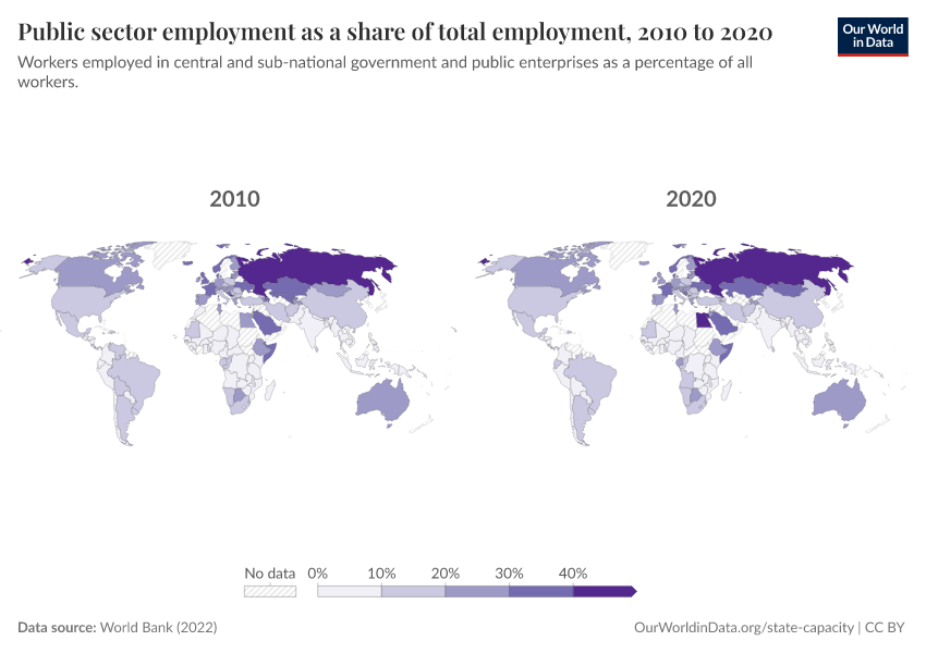 World Bank (2022) – with minor processing by Our World in Data. “Public sector employment as a share of total employment” [dataset]. World Bank, “Worldwide Bureaucracy Indicators (WWBI) Version 3” [original data]. Retrieved February 7, 2026 from https://archive.ourworldindata.org/20260105-133053/grapher/public-sector-employment-as-a-share-of-total-employment.html (archived on January 5, 2026).