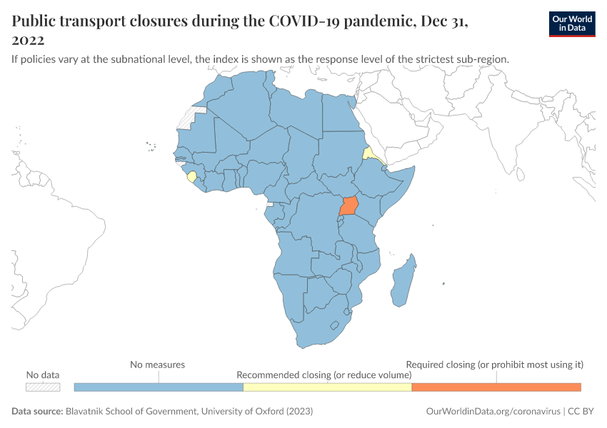 Blavatnik School of Government, University of Oxford (2023) – with minor processing by Our World in Data. “Public transport closures during the COVID-19 pandemic” [dataset]. Blavatnik School of Government, University of Oxford, “Government Response Tracker (OxCGRT)” [original data]. Retrieved January 14, 2026 from https://archive.ourworldindata.org/20250909-093708/grapher/public-transport-covid.html (archived on September 9, 2025).