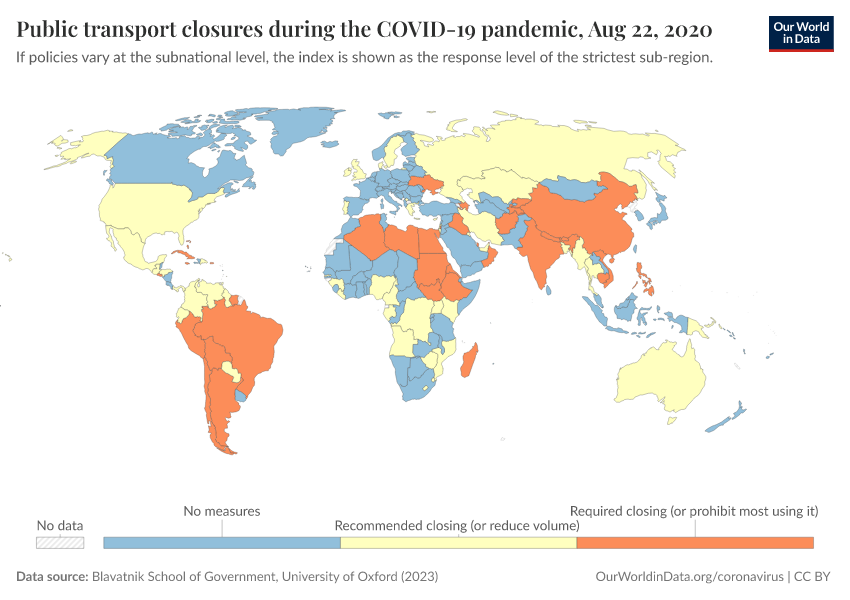 Blavatnik School of Government, University of Oxford (2023) – with minor processing by Our World in Data. “Public transport closures during the COVID-19 pandemic” [dataset]. Blavatnik School of Government, University of Oxford, “Government Response Tracker (OxCGRT)” [original data]. Retrieved April 26, 2026 from https://archive.ourworldindata.org/20260304-094028/grapher/public-transport-covid.html (archived on March 4, 2026).Download