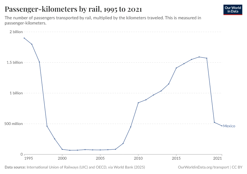 “Data Page: Passenger-kilometers by rail”. Our World in Data (2025). Data adapted from International Union of Railways (UIC) and OECD, via World Bank. Retrieved from https://archive.ourworldindata.org/20250916-102301/grapher/railways-passengers-carried-passenger-km.html [online resource] (archived on September 16, 2025).