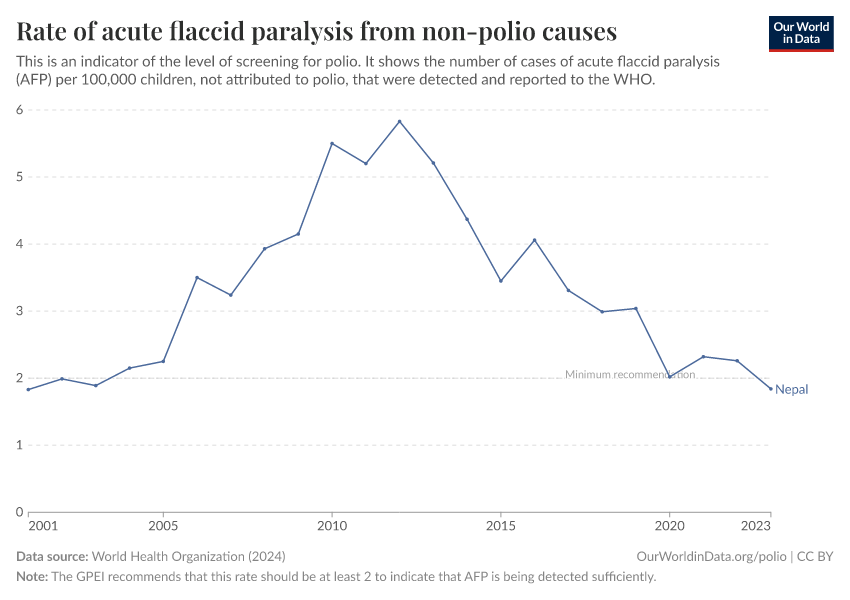 World Health Organization (2024) – processed by Our World in Data. “Rate of acute flaccid paralysis from non-polio causes” [dataset]. World Health Organization, “Polio Cases and Acute Flaccid Paralysis (AFP) Surveillance” [original data]. Retrieved December 5, 2025 from https://archive.ourworldindata.org/20250909-093708/grapher/rate-of-acute-flaccid-paralysis-from-non-polio-causes.html (archived on September 9, 2025).