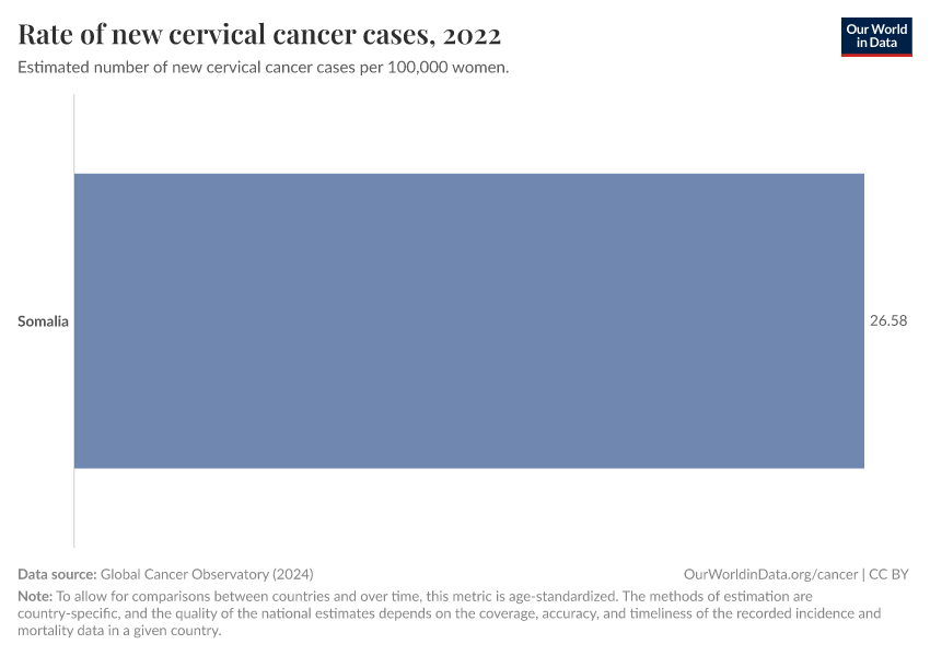 Global Cancer Observatory (2024) – processed by Our World in Data. “Rate of new cervical cancer cases” [dataset]. Global Cancer Observatory, “Cancer Today - Cervical cancer” [original data]. Retrieved December 29, 2025 from https://archive.ourworldindata.org/20250909-093708/grapher/rate-of-new-cervical-cancer-cases-gco.html (archived on September 9, 2025).