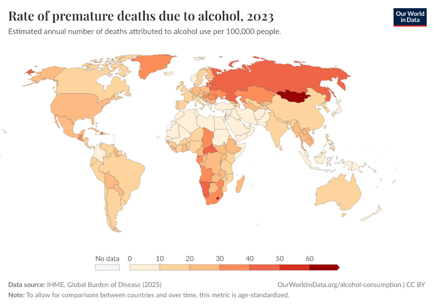 IHME, Global Burden of Disease (2024) – with minor processing by Our World in Data. “Rate of premature deaths due to alcohol” [dataset]. IHME, Global Burden of Disease, “Global Burden of Disease - Risk Factors” [original data]. Retrieved December 11, 2025 from https://archive.ourworldindata.org/20250909-093708/grapher/rate-of-premature-deaths-due-to-alcohol.html (archived on September 9, 2025).