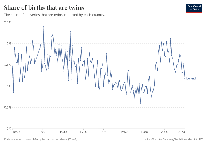 “Data Page: Share of births that are twins”, part of the following publication: Saloni Dattani, Lucas Rodés-Guirao, and Max Roser (2025) - “Fertility Rate”. Data adapted from Human Multiple Births Database. Retrieved from https://archive.ourworldindata.org/20250909-093708/grapher/rate-of-twin-deliveries.html [online resource] (archived on September 9, 2025).How to cite this data