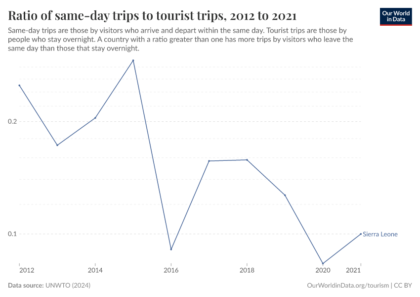 “Data Page: Ratio of same-day trips to tourist trips”, part of the following publication: Bastian Herre and Veronika Samborska (2023) - “Tourism”. Data adapted from UNWTO. Retrieved from https://archive.ourworldindata.org/20250909-093708/grapher/ratio-of-same-day-to-tourist-trips.html [online resource] (archived on September 9, 2025).How to cite this data