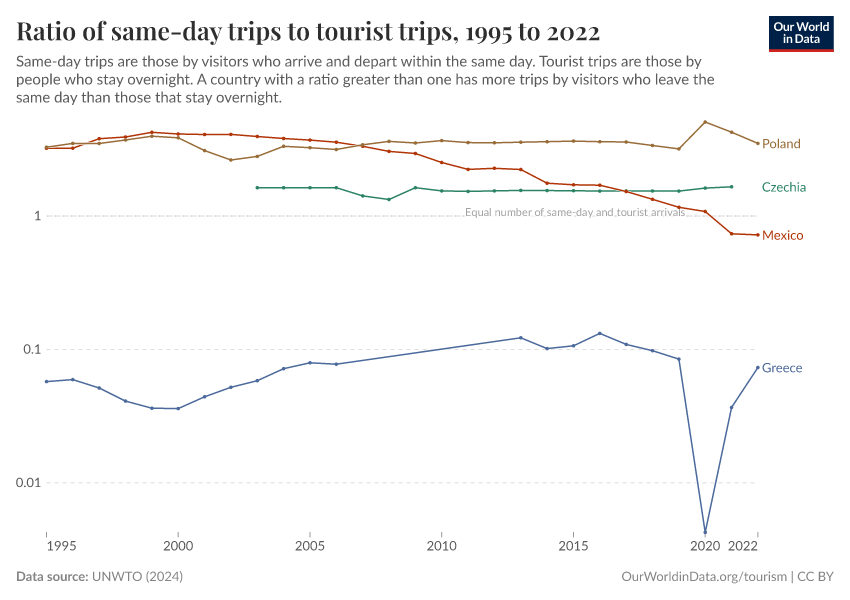 “Data Page: Ratio of same-day trips to tourist trips”, part of the following publication: Bastian Herre and Veronika Samborska (2023) - “Tourism”. Data adapted from UNWTO. Retrieved from https://archive.ourworldindata.org/20250909-093708/grapher/ratio-of-same-day-to-tourist-trips.html [online resource] (archived on September 9, 2025).How to cite this data