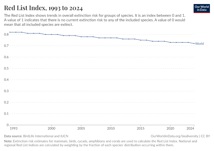 “Data Page: Red List Index”. Our World in Data (2025). Data adapted from BirdLife International and IUCN. Retrieved from https://archive.ourworldindata.org/20251125-165536/grapher/red-list-index.html [online resource] (archived on November 25, 2025).How to cite this data