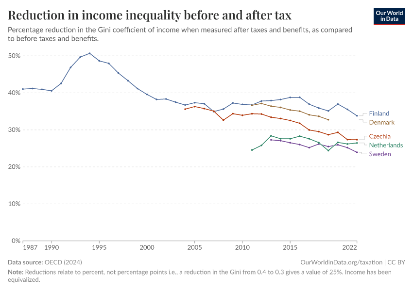 “Data Page: Reduction in income inequality before and after tax”, part of the following publication: Joe Hasell, Bertha Rohenkohl, Pablo Arriagada, Esteban Ortiz-Ospina, and Max Roser (2023) - “Economic Inequality”. Data adapted from OECD. Retrieved from https://archive.ourworldindata.org/20250909-093708/grapher/reduction-in-income-inequality.html [online resource] (archived on September 9, 2025).