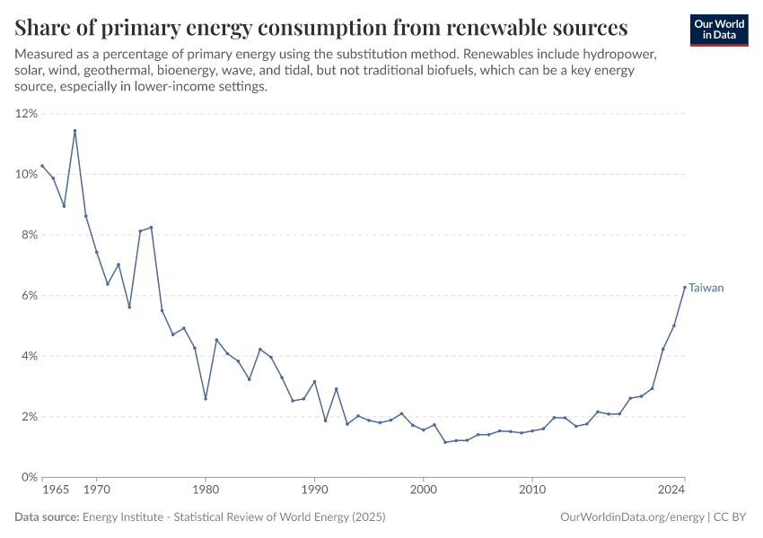 Energy Institute - Statistical Review of World Energy (2025) – with major processing by Our World in Data. “Share of primary energy consumption that comes from renewables – Using the substitution method” [dataset]. Energy Institute, “Statistical Review of World Energy” [original data]. Retrieved December 5, 2025 from https://archive.ourworldindata.org/20250909-093708/grapher/renewable-share-energy.html (archived on September 9, 2025).