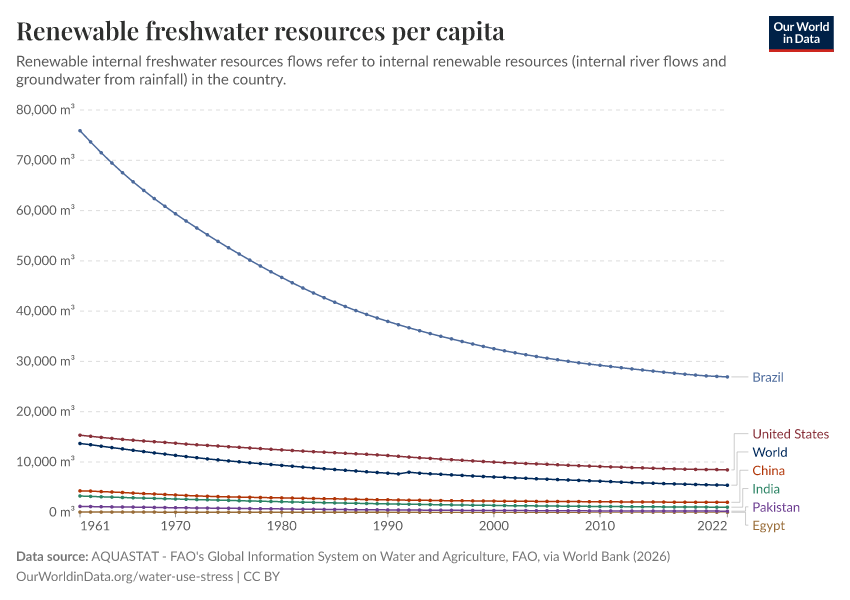 “Data Page: Renewable freshwater resources per capita”. Our World in Data (2026). Data adapted from AQUASTAT - FAO's Global Information System on Water and Agriculture, FAO, via World Bank. Retrieved from https://archive.ourworldindata.org/20260202-181317/grapher/renewable-water-resources-per-capita.html [online resource] (archived on February 2, 2026).How to cite this data